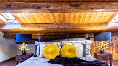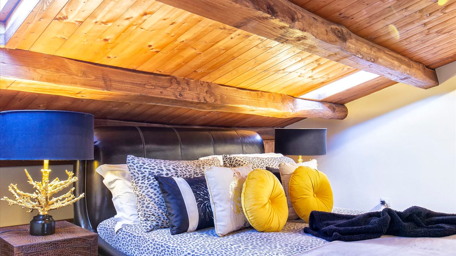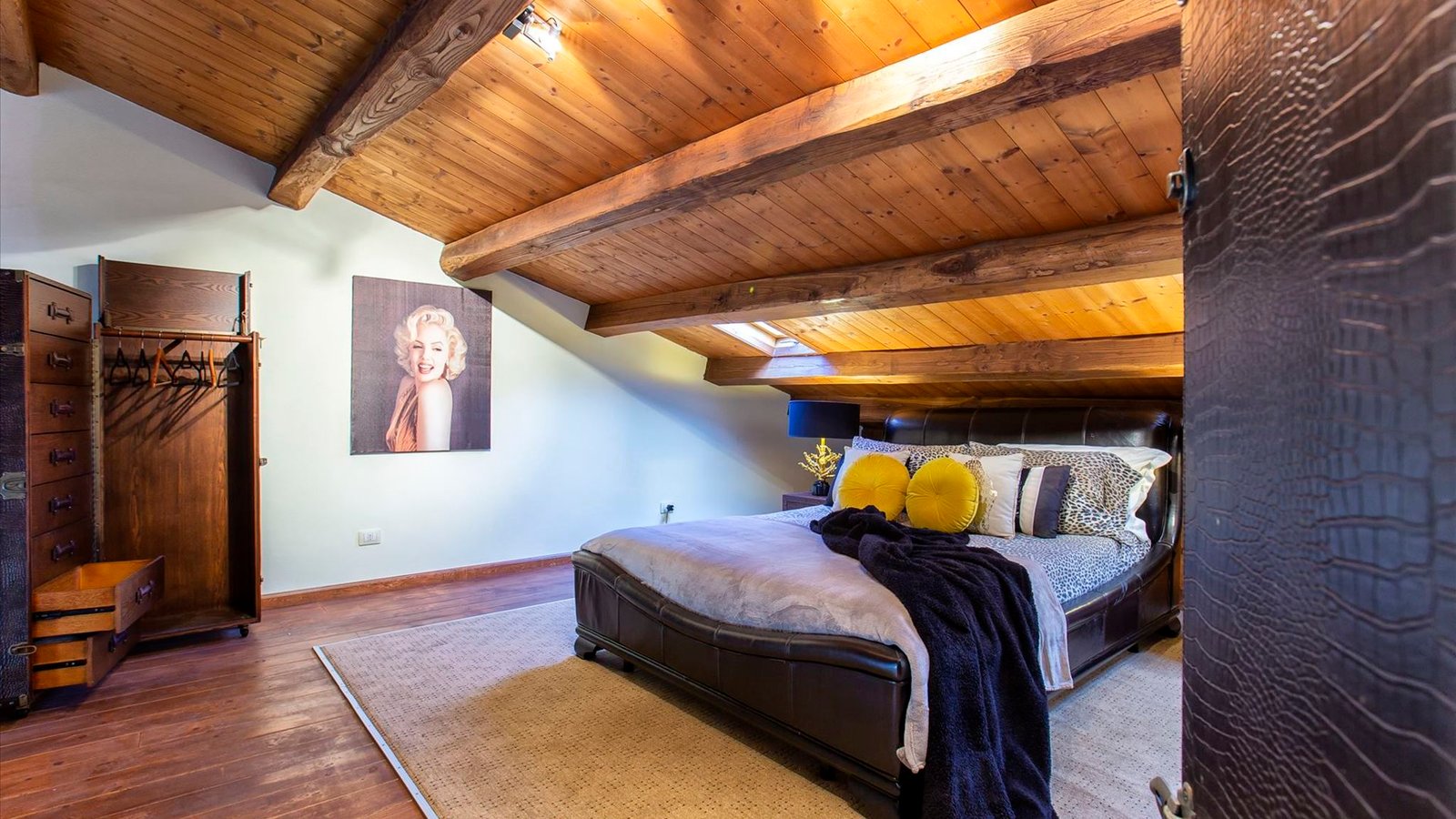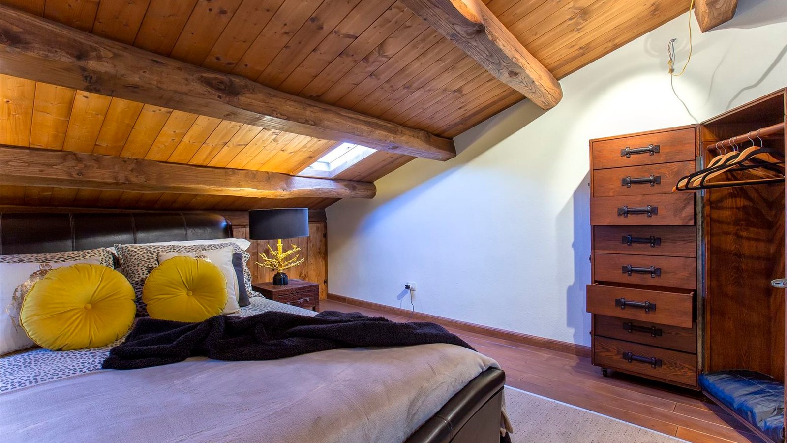 The sleeping area includes a double bed located in the attic, reachable through a staircase located in the living room.
