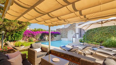 Villa enjoys a strategic location with a seaview, garden view and pool view .