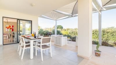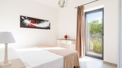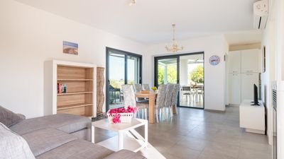 The villa boasts a private swimming pool, perfect for cooling off on warm days, and is surrounded by a lush garden, offering plenty of outdoor space for relaxation. The outdoor area also includes a barbecue, an outdoor dining space, and a solarium where you can unwind while enjoying the panoramic sea views.