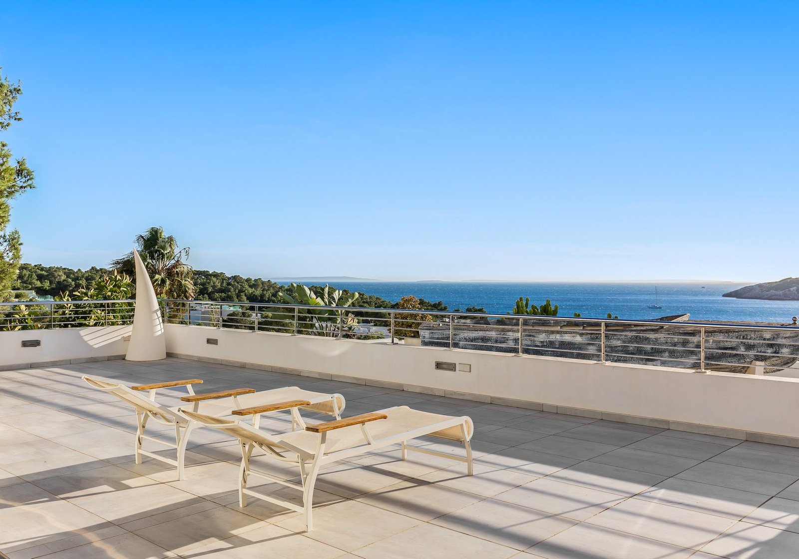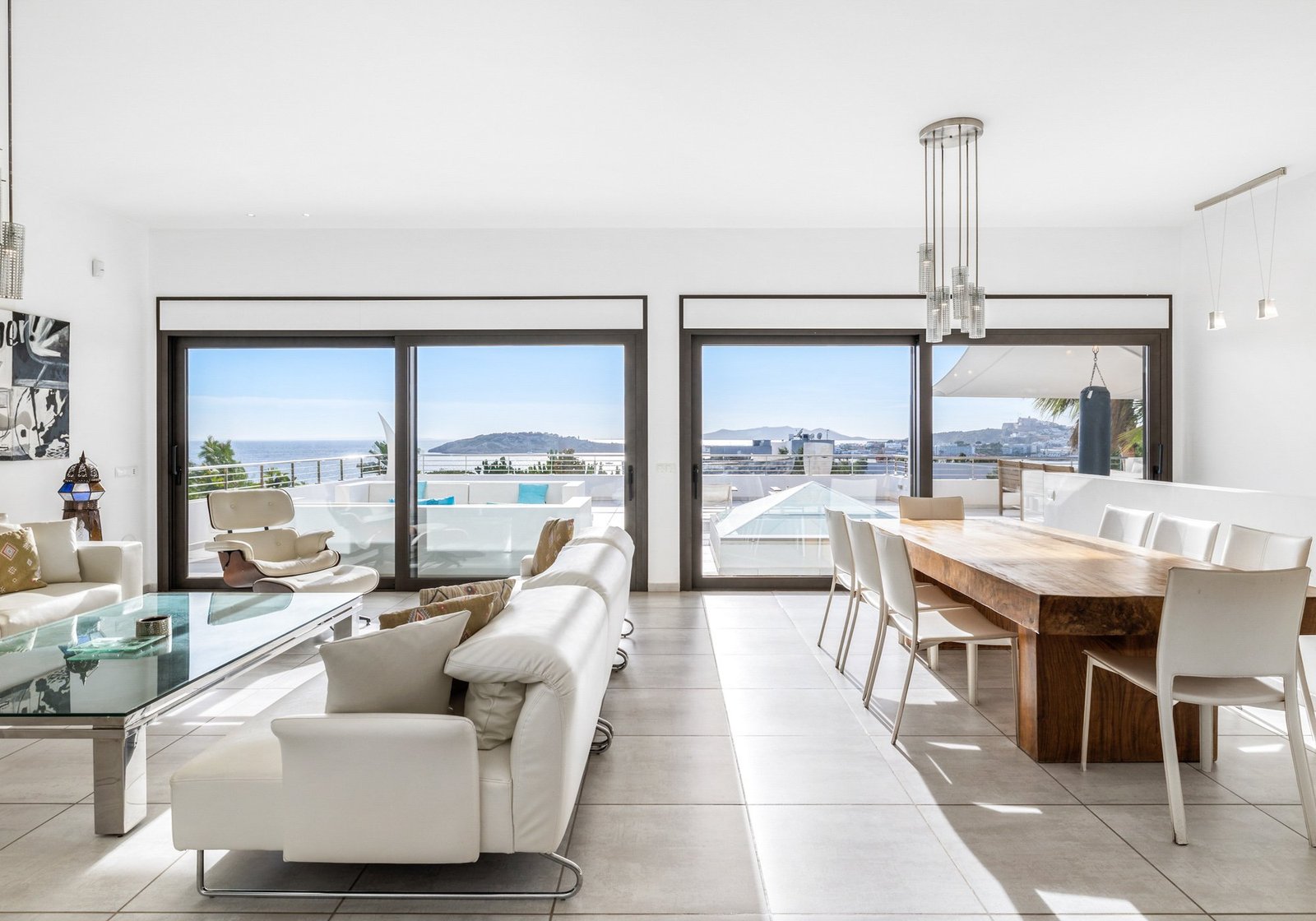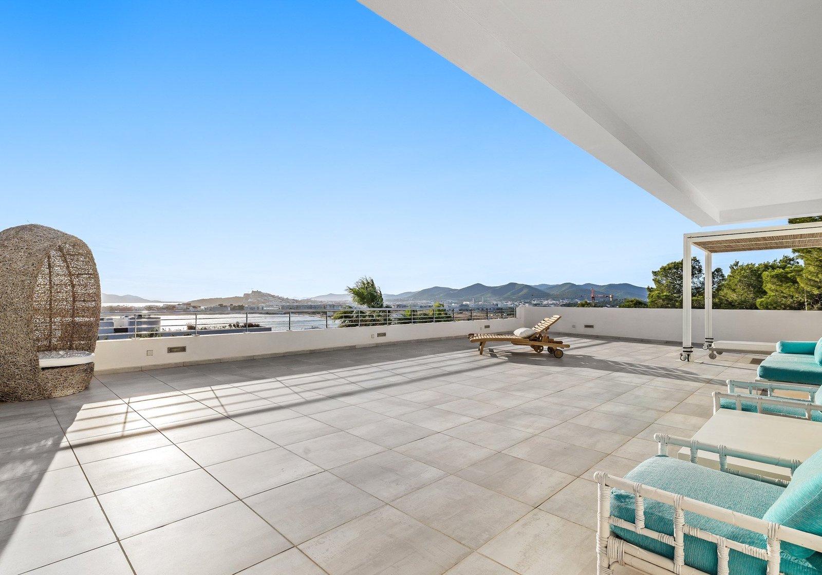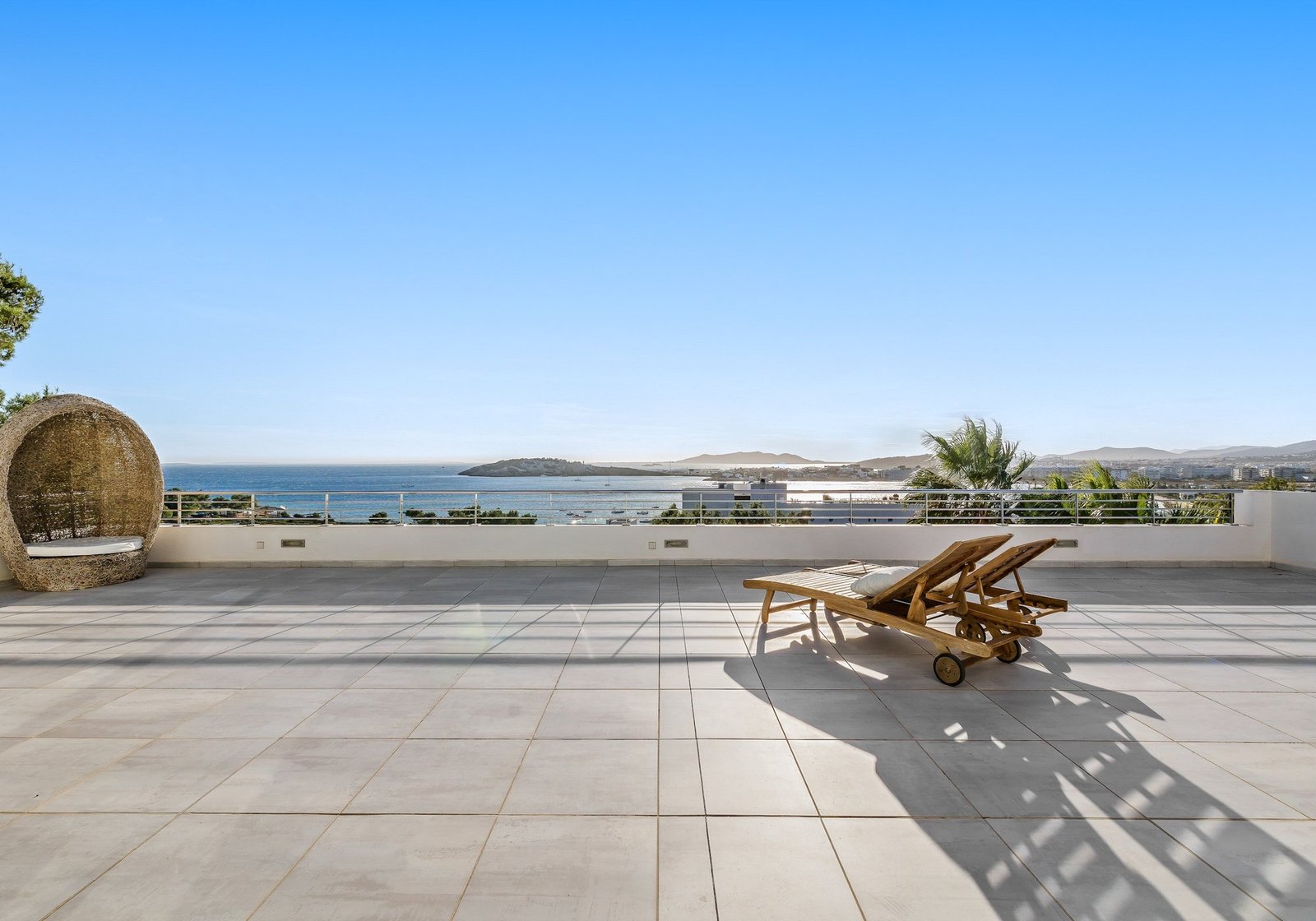 A large terrace including a swimming pool offers stunning views of the sea and plenty of places to relax and enjoy a glass of champagne. Whether you choose to relax with a book by the pool, enjoy a glass of wine while marveling at the sea view or enjoy the nightlife in Ibiza town, this property is the perfect getaway.