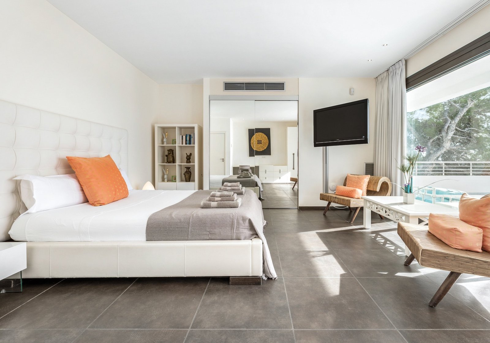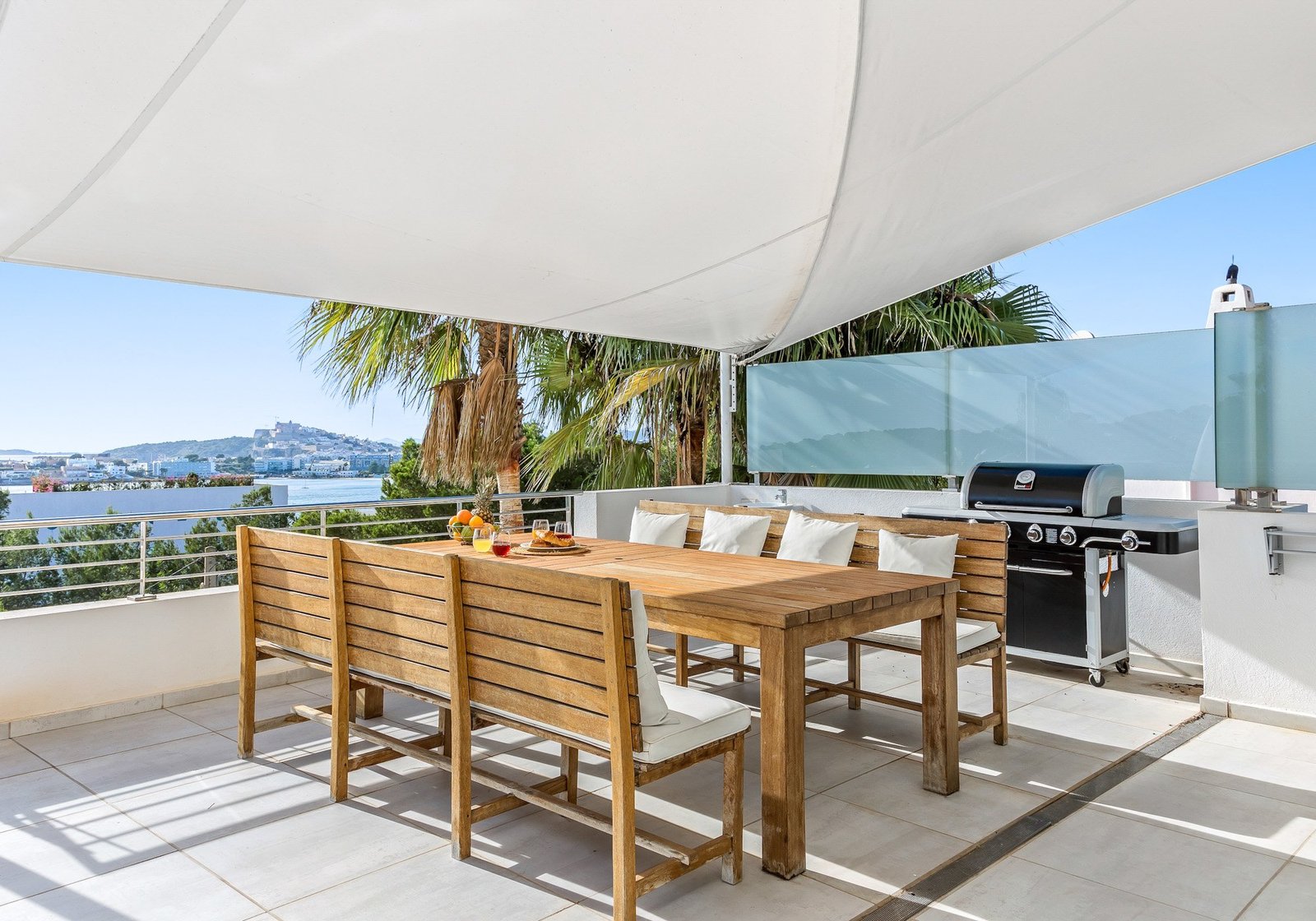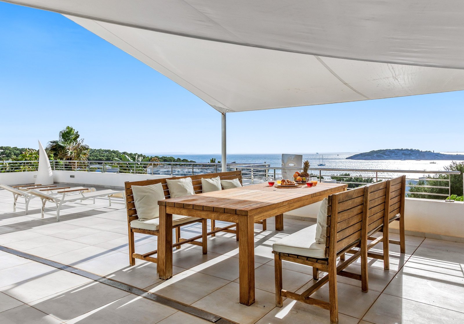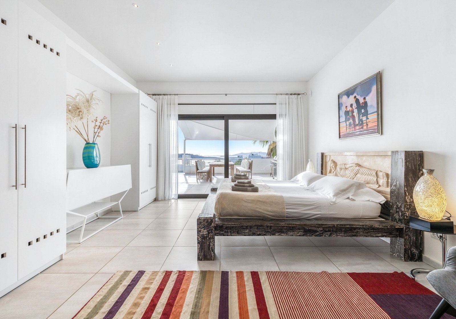 A large terrace including a swimming pool offers stunning views of the sea and plenty of places to relax and enjoy a glass of champagne. Whether you choose to relax with a book by the pool, enjoy a glass of wine while marveling at the sea view or enjoy the nightlife in Ibiza town, this property is the perfect getaway.