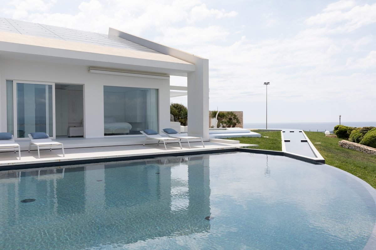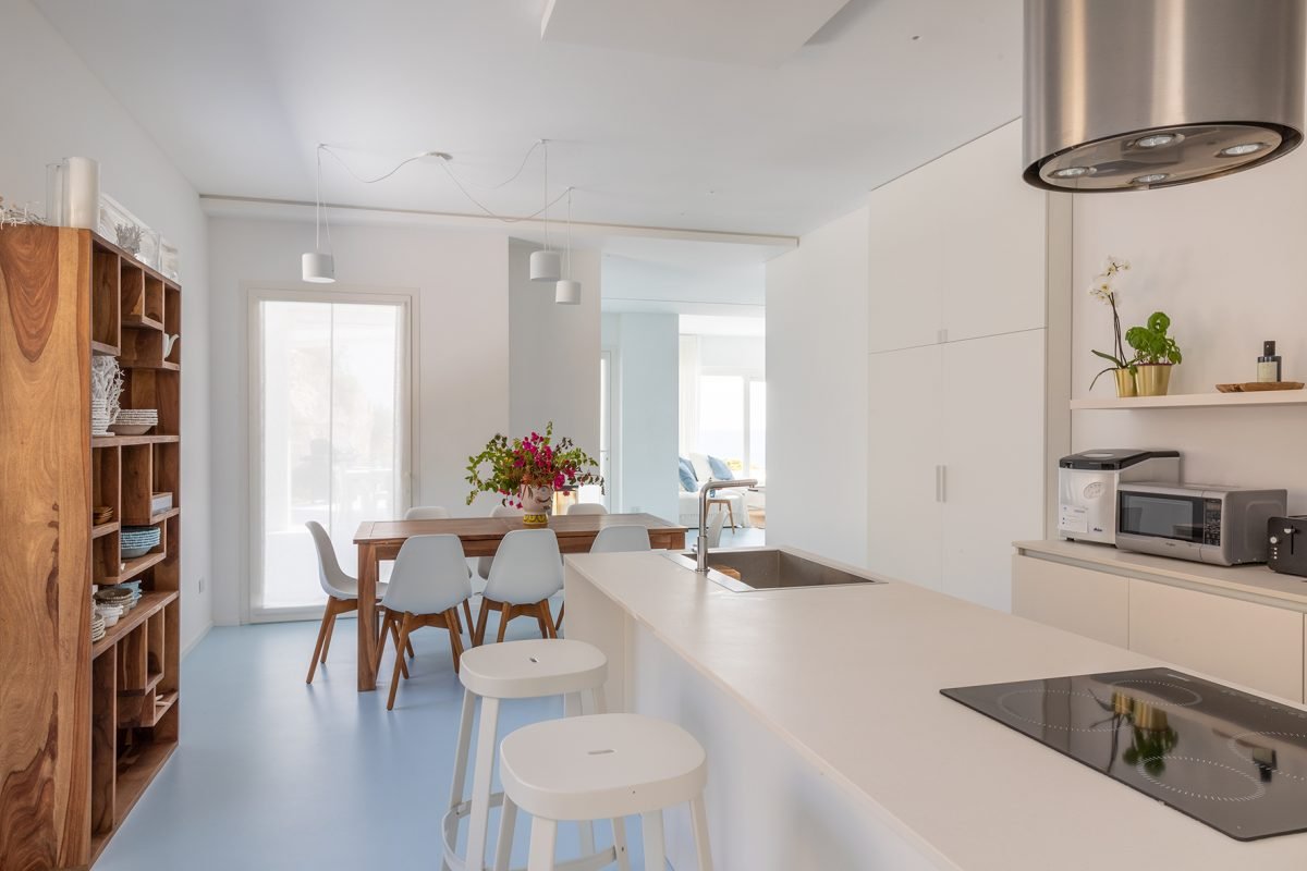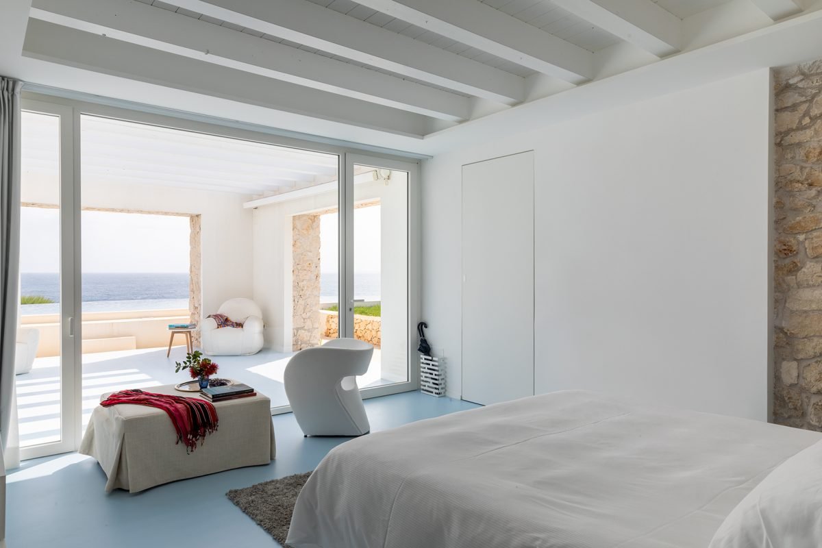 The villa’s interiors are as resplendent as its vibrant exterior surroundings. Tones of azure and sky-blue carry through from the outside to the inside, harmoniously fused together in the colour scheme and decor and further amplified through the large glass windows. The view of the sea can be admired as comfortably from the sofa in the living room or from the bedroom, as from the superb terraces that surround the villa.