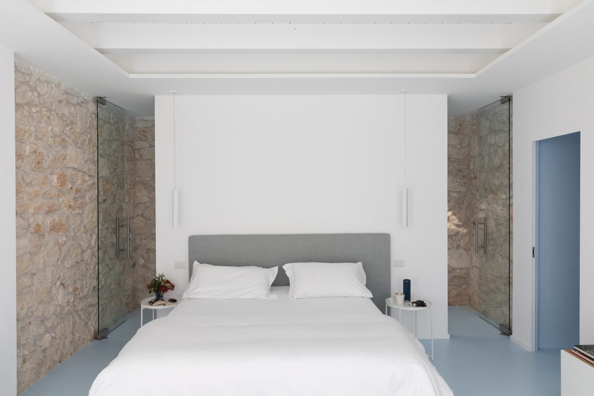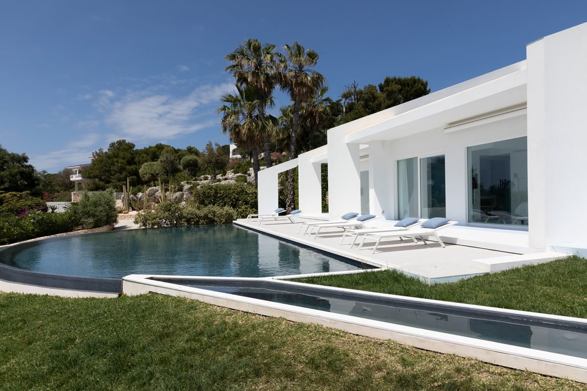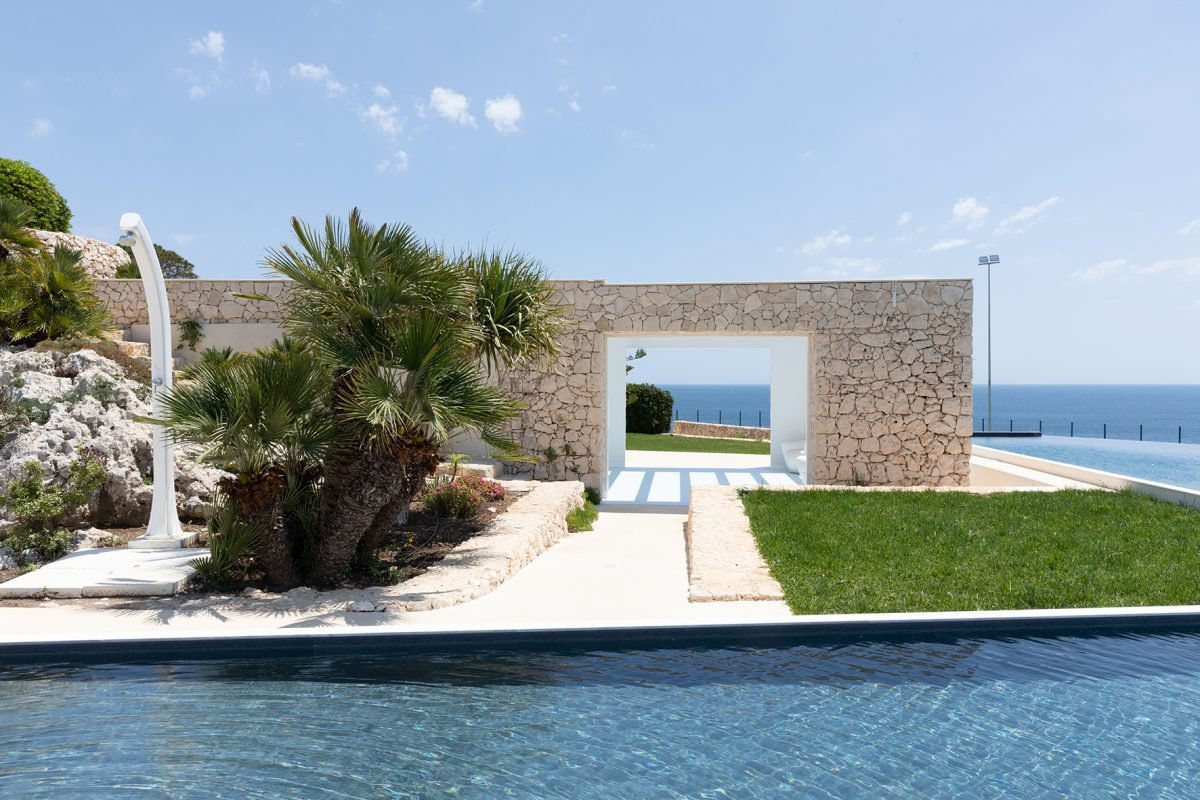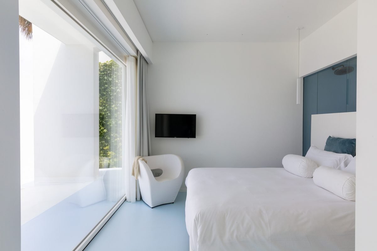 The villa’s interiors are as resplendent as its vibrant exterior surroundings. Tones of azure and sky-blue carry through from the outside to the inside, harmoniously fused together in the colour scheme and decor and further amplified through the large glass windows. The view of the sea can be admired as comfortably from the sofa in the living room or from the bedroom, as from the superb terraces that surround the villa.