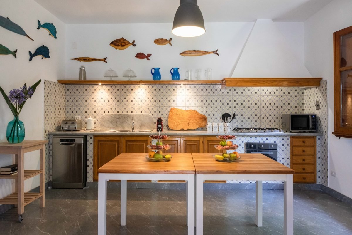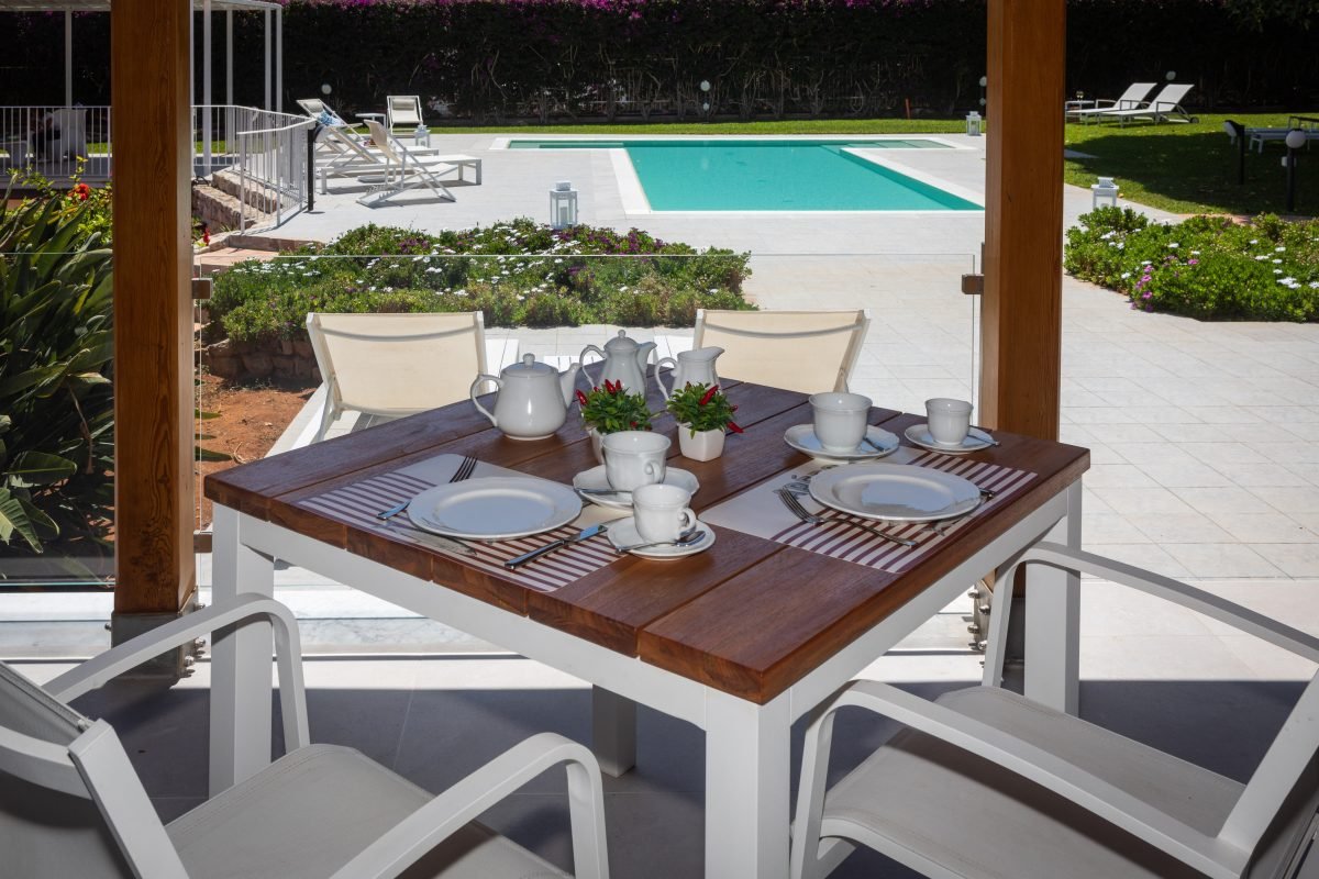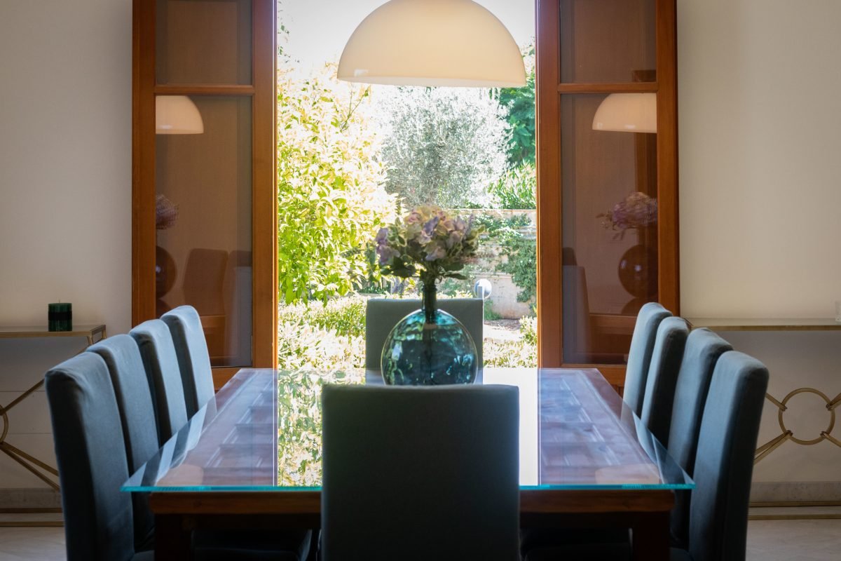 The villa is on 3 levels connected by flights of stairs: on the garden level is a very large living area with fireplace, TV room, dining room, large kitchen, office and guest bathroom. The living room overlooks a large sheltered portico — creating a perfect outdoor dining area, sheltered from the heat of the mid-day sun.