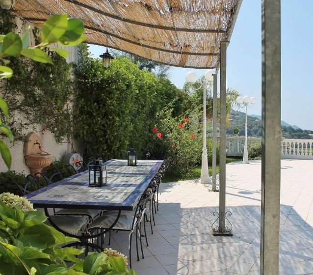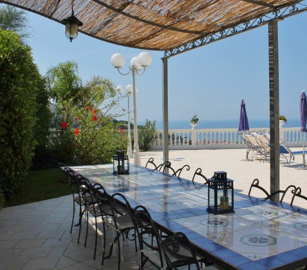 The garden and the terraces of the villa have a limitless view of the Gulf of Salerno, from the cape of Punta Licosa nearby to the horizon on the far side, with the unmistakable profile of the island of Capri and of the Amalfi Coast.