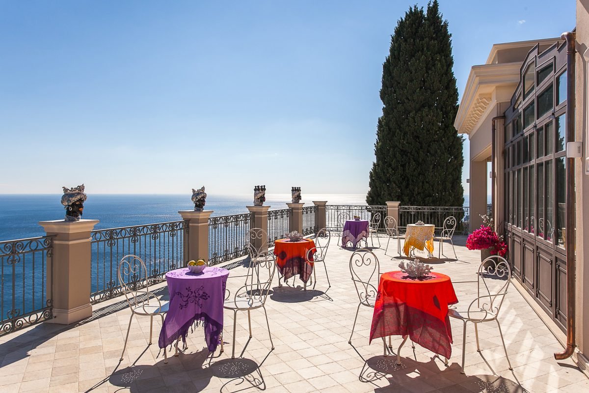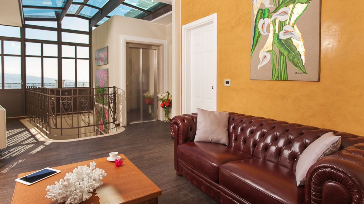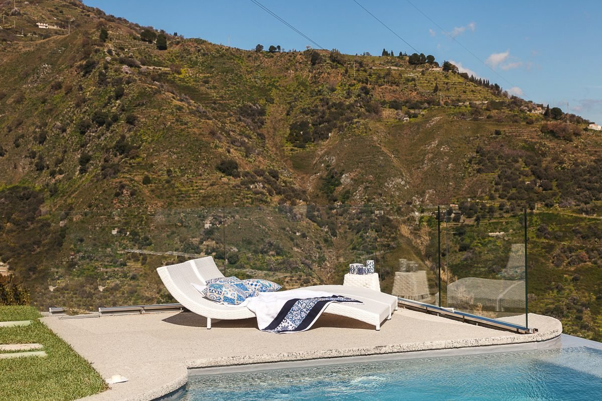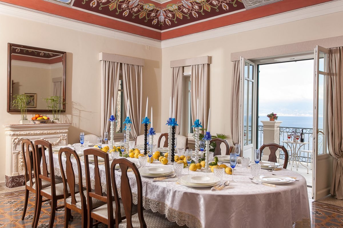 Villa Cariddi is laid out on three levels: on the ground floor is the kitchen ( it’s a professional kitchen) and – occupying the original palmento, or grape-crushing room – a breakfast room with panoramic views from its terrace.