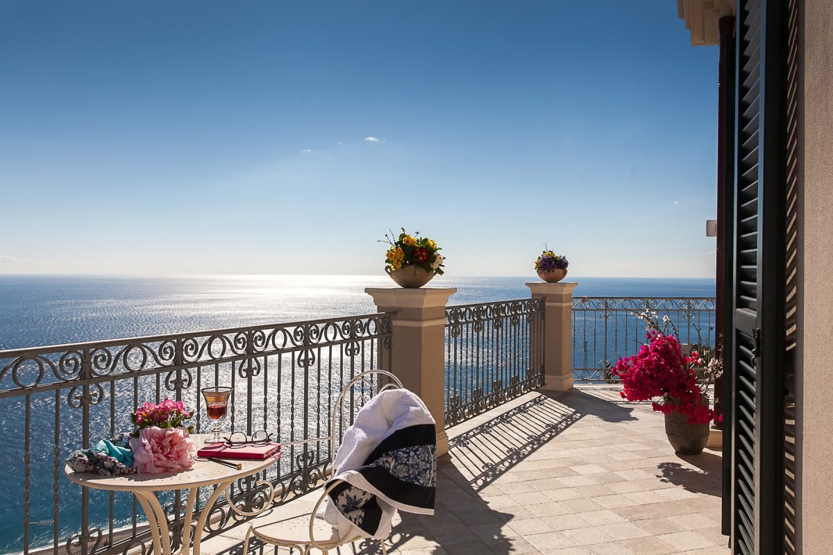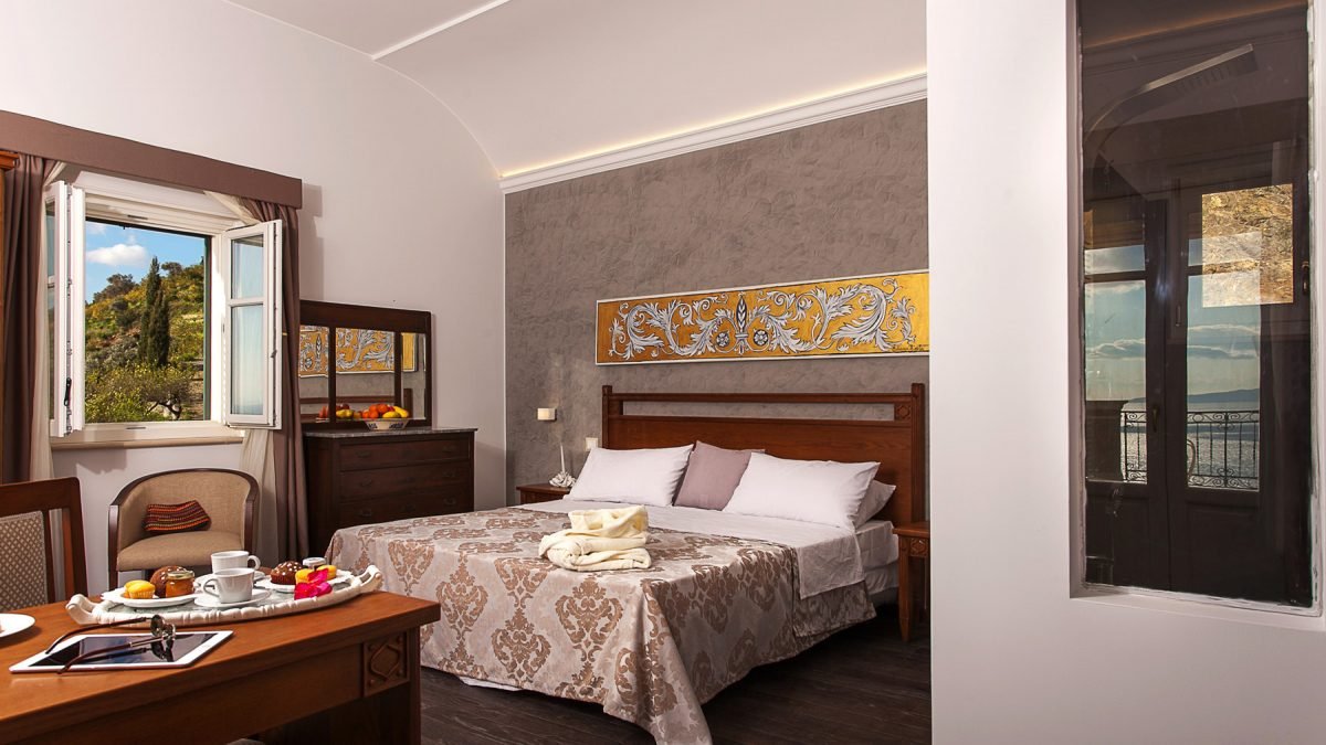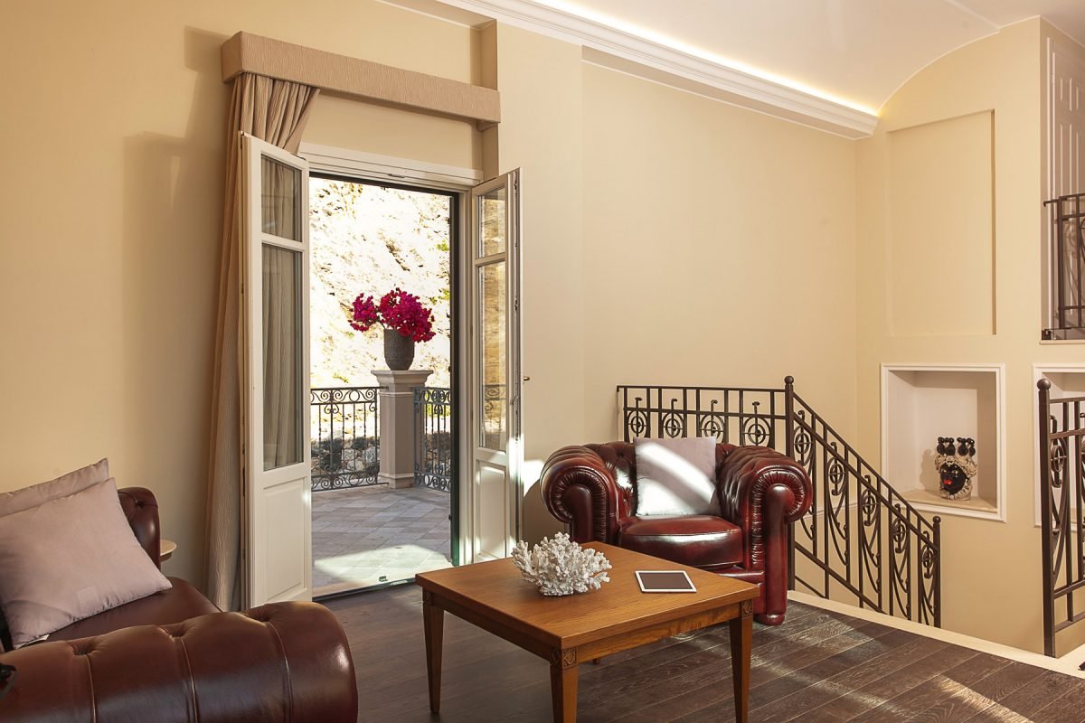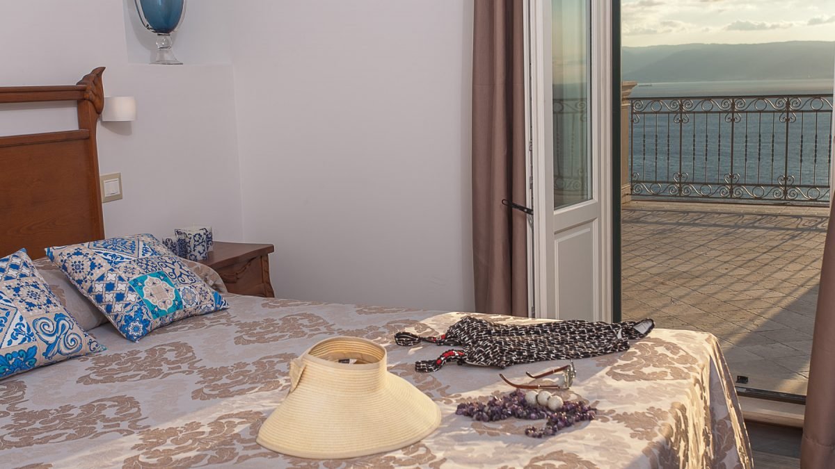 Villa Cariddi is laid out on three levels: on the ground floor is the kitchen ( it’s a professional kitchen) and – occupying the original palmento, or grape-crushing room – a breakfast room with panoramic views from its terrace.